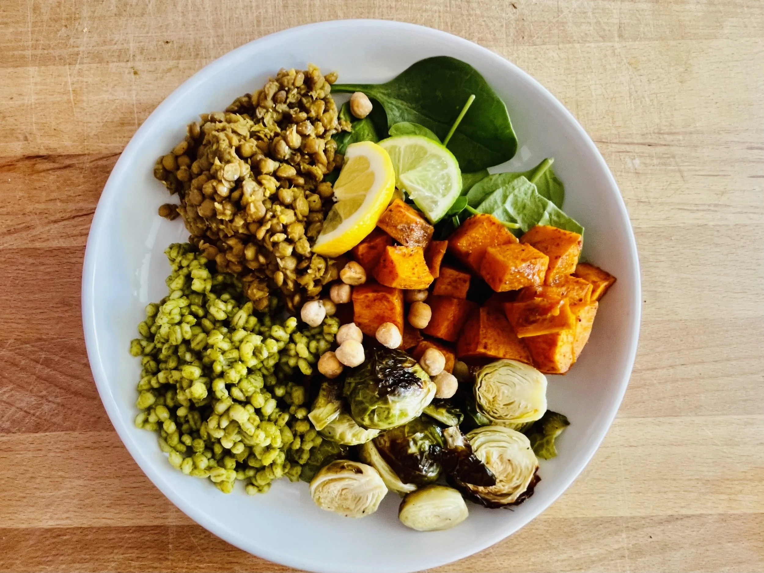 Green barley, orange sweet potato, roasted mini cabbage (aka Brussels Sprouts) and curried lentils put a nutritious boost in your Nutrition Month and St Patrick’s Day.