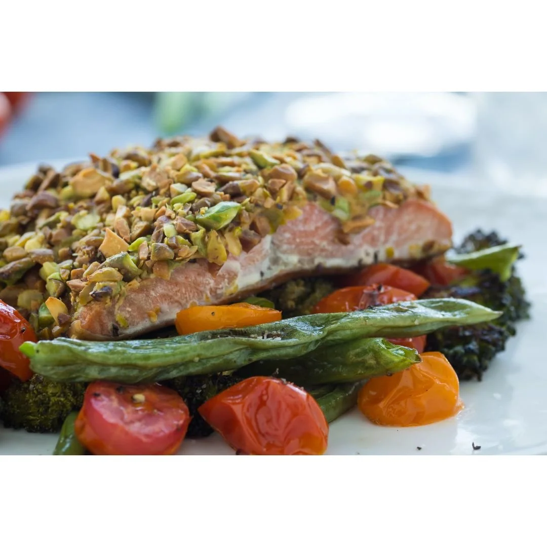 Simple enough for a weeknight dinner yet fancy enough for a special occasion. Try this recipe as noted with salmon or swap for another protein like chicken or pork tenderloin. The pistachio crust is delicious and satisfying. Delicious accompanied with quinoa winter fruit salad.
